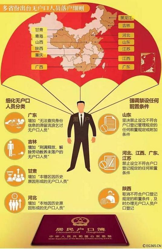 2016年1月,國務院發(fā)布解決無戶口人員登記戶口問題的意見,提出為8類無戶口人員登記常住戶口。國務院發(fā)文5個月之后,記者梳理發(fā)現(xiàn),目前已有重慶、河北、山東、山西、甘肅、青海、黑龍江、吉林、江蘇、江西、廣西、廣東、陜西等13個省(自治區(qū))出臺了相關實施意見和細則。